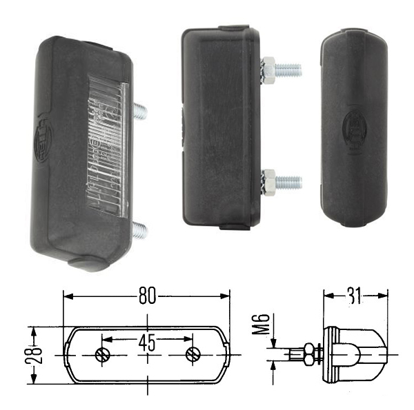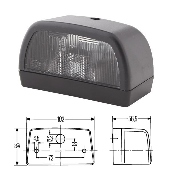 Fanale targa tipo HELLA base pianacon passacavo. Misure: 82 X 30 X 32 Confezione pz.: 1...